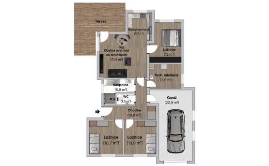 Užitná plocha domu činí 113 m², zastavěná plocha 140 m².